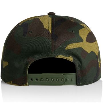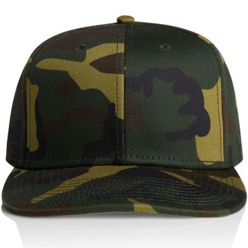 include a structured front, plastic snapback closure, flat peak, tonal under-peak lining, stitching eyelets, and a self-fabric dome. One size fits all with a tear-out AS Colour label for personalised comfort.