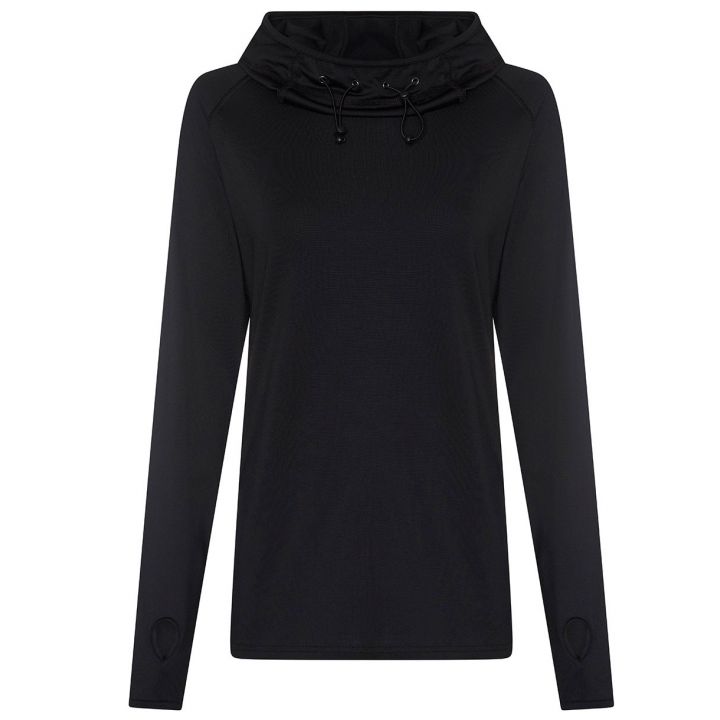 Fit blended fabric with elastane, it offers stretch for a flattering feminine fit. The cowl neck hood, raglan sleeves, and thumb holes provide functional style, making it ideal for layering before, during, or after workouts.