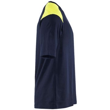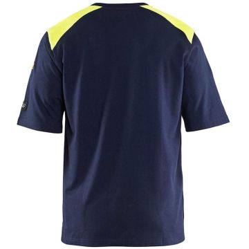 Flame-resistant T-shirt in comfortable and flexible single jersey with inherent flame-resistant properties. Featuring yellow colours on the shoulders for increased visibility, a crew neck and reinforced neck and shoulder seams.