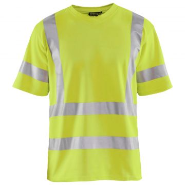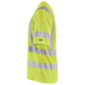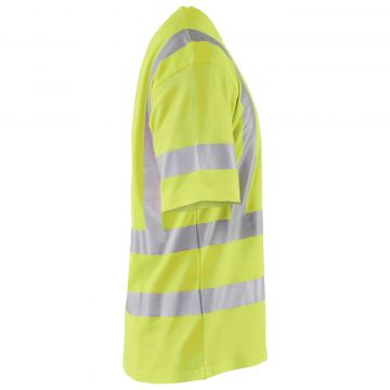 Short sleeve high visibility t-shirt with V-neck and stretchable reflectors in a new and comfortable material. The fabric has a cotton inside and a synthetic outside which provide a high comfort and eases to wash away odours.