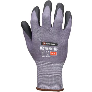 With a lightweight liner featuring Blackrock's Dextrafit technology that stretches and flexes to the contours of the hand for a perfect fit, the Oxygen work glove offers excellent wet, dry and outstanding oily handling thanks to its nitrile foam coating.
