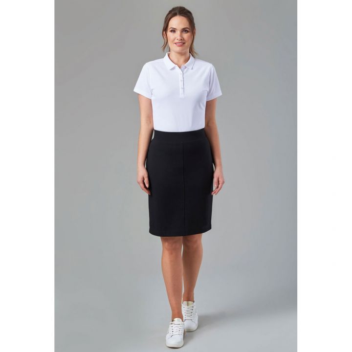 The Leona Jersey Stretch Skirt offers a clean, streamlined silhouette with a comfortable pull-on design. Crafted from a soft bi-stretch jersey fabric, this straight skirt provides ease of movement and a polished professional appearance suitable for everyday uniform wear.