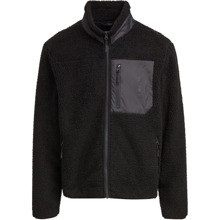 Its woven polyester shell provides a sturdy yet comfortable layer, while a bonded sherpa lining adds warmth without bulk