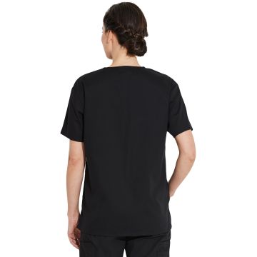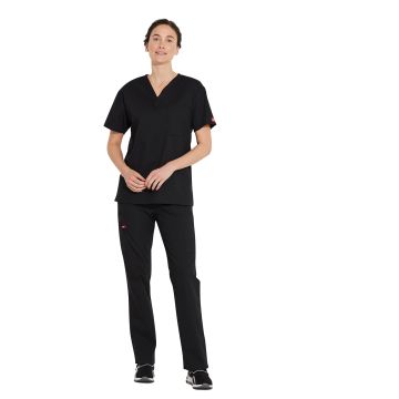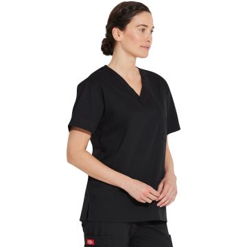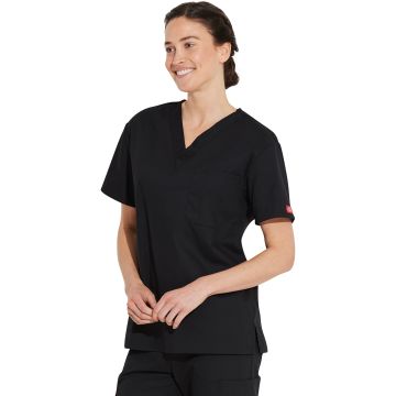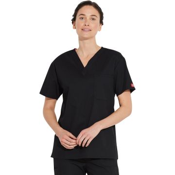 Unisex Fit, V-neck top features Dickies logo twill tape at the back neck, a front chest pocket with a bar-tacked pencil slot and side vents.