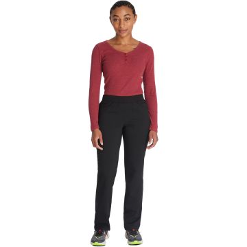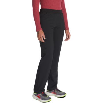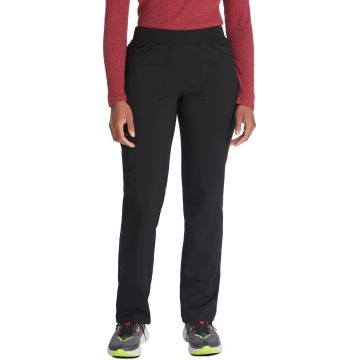 This comfortable and functional mid rise pull-on pant features a tapered leg, a rib-knit waistband with encased elastic and inside drawstring for full waist support.