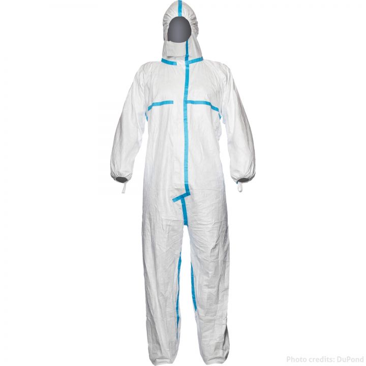 - Self-adhesive zipper and chin flap (for tight fit around respirator).