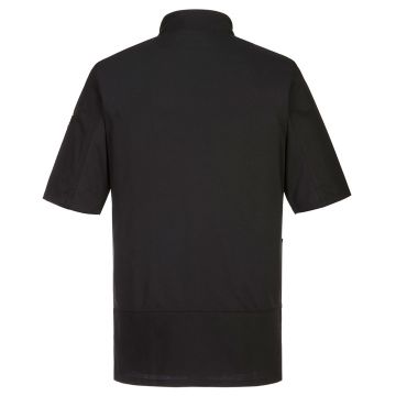 The Surrey Chefs Jacket Short Sleeve is designed for modern kitchens, combining a lightweight fabric with a slim, ergonomic fit. Featuring a concealed double-breasted stud fastening, zipped side pocket, and large Mesh
