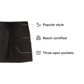 A popular style of apron seen in many bars and restaurants, this short waist apron has three open pockets. From the Premier '
