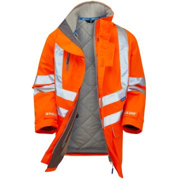 Stay dry, warm, and visible. Built with a 2-layer recycled polyester waterproof fabric and soft quilted insulation, this high visibility coat features solid reflective tape, a fleece-lined collar, multiple secure pockets, and a pack-away hood, perfect for tough weather and demanding work environments.