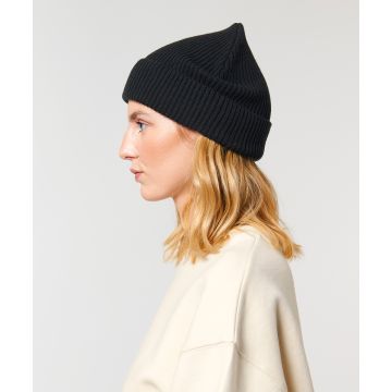Wide rib beanie which can be turned up with one or two folds. Made of organic cotton. Unisex fit, in a wide range of colours.