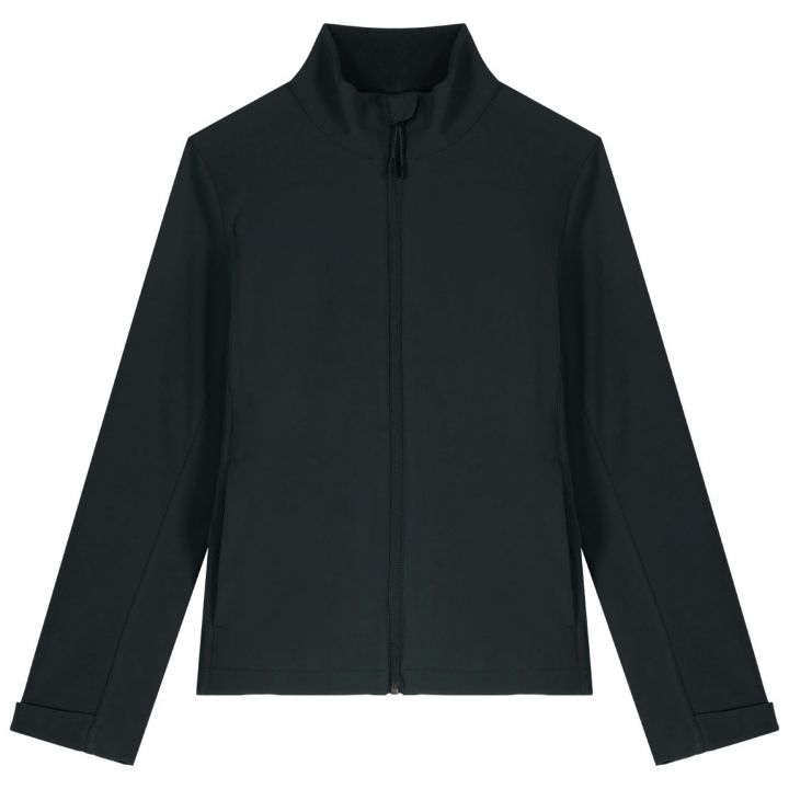 - Women’s softshell jacket, medium fit with a high collar and set-in sleeve.