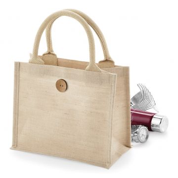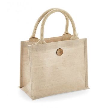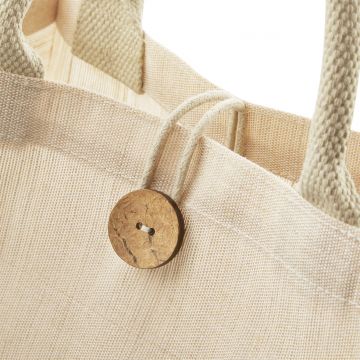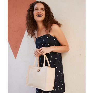 Refined Jute/Cotton blend for ease of decoration. Cotton carry handles. Handle length: 35 cm.